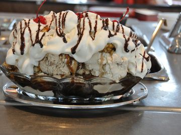 Giant size- Vanilla ice cream, chopped nuts, fresh whipped cream and covered in topping of your choice Banana, chocolate, strawberry or spearmint.